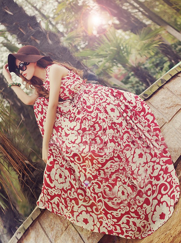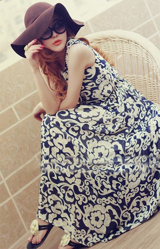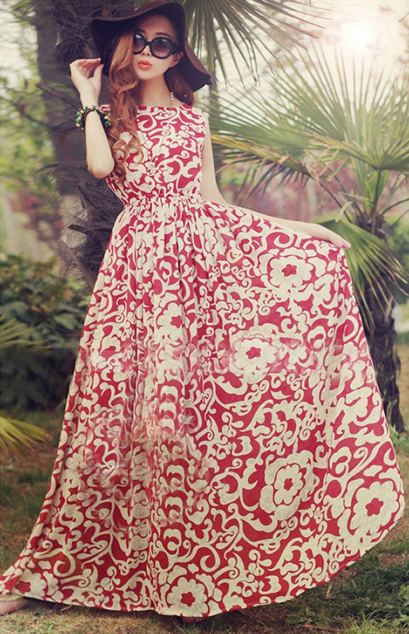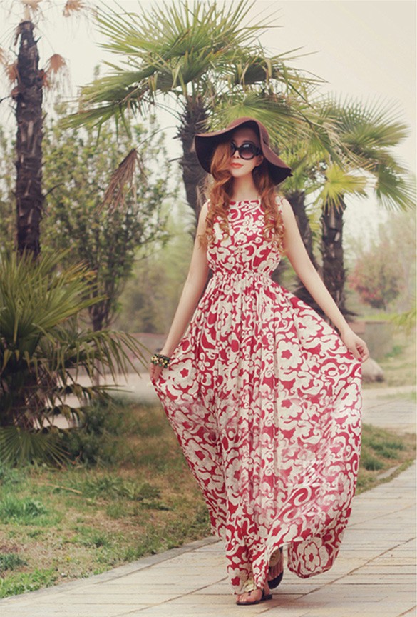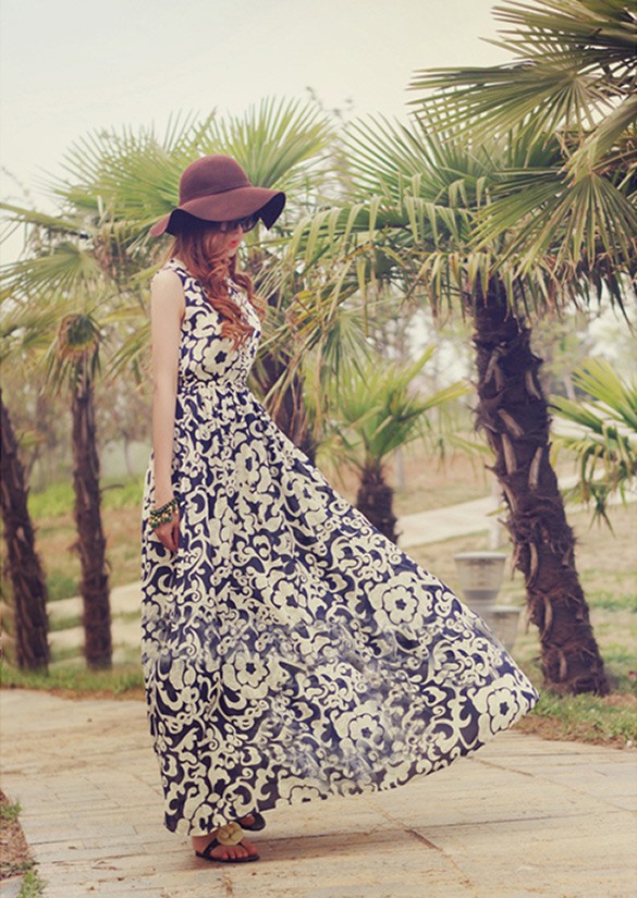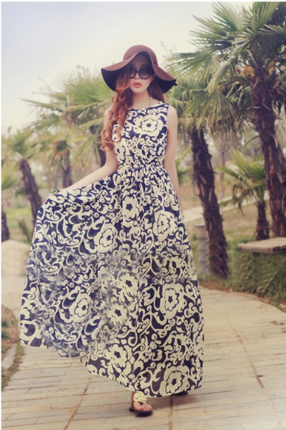 2016 frauen Sommer Kleid Mode-Dame Sexy Sleeveless Oansatz Druck Lange Maxi Chiffon-Kleid