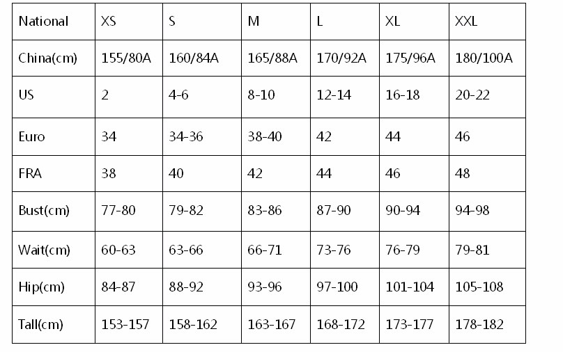 wählen sie die größe, die besten übereinstimmungen ihre größte messung (fehlschlag, taille oder hüfte). wenn sie zwischen die größen, es ist in der regel am besten, die größere größe bestellen, so dass sie raum zu bewegen, oder einige änderungen können leicht gemacht werden.a. Fehlschlaglassen sie ihre arme hängen natürlich an ihren sides. haben jemand messen sie mit der mess; band parallel zum boden. haben ihre freundin unter ihre unterarme, um ihren rücken und über das vollste teil ihrer büste. sicherzustellen, dass die maßband ist snug aber nicht eng.b. Taillebücken, um eine seite zu finden die spot; wo ihre taille natürlich falten. messen dieser ort; es sollte rechts unter ihre nave l. Halten die messung band parallel auf den boden und gegen ihre haut, aber nicht ziehen es eng.c. Hüfteaufstehen gerade mit ihre füße zusammen. haben einen freund maßnahme über ihre hüften und hinten, um das vollste teil. machen sicher zu halten die maßband parallel zum boden.wenn Ich eine bestellung aus, können sie mir die artikel bilder ohne wasserzeichen?natürlich, wir könnten sie das einzelteil bilder ohne wasserzeichen wenn sie wollen, aber sie haben zu sagen uns wenn sie ihren auftrag vergeben.tun sie tropfenverschiffen tun?ja, wir könnten lassen verschiffen zu weltweit für sie, einfach in ihrem kunden adresse bei der bestellung.kann Ich mix farben zur gleichen stil artikel?ja, regel viele einzelteile haben einige verschiedene farben. So wenn sie mischen möchten in verschiedenen farben, erwähnen sie bitte, welche farben sie wünschen und wenn sie ihren auftrag vergeben. wenn nicht, wir in der regel nur senden sie das einzelteil farben wie gezeigt, dass sie bestellen.muss Ich importtarife zahlen?