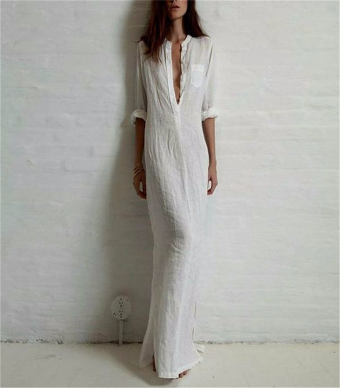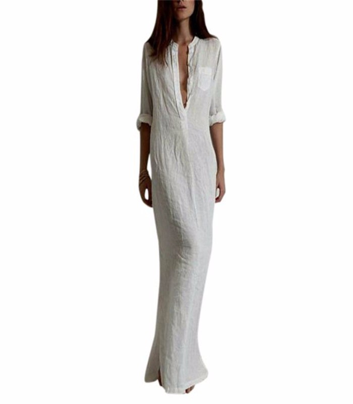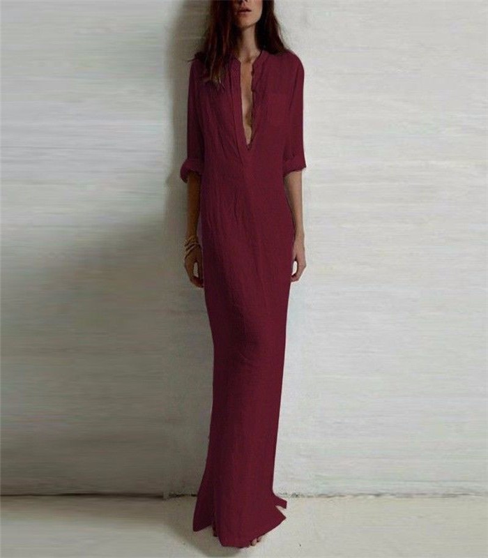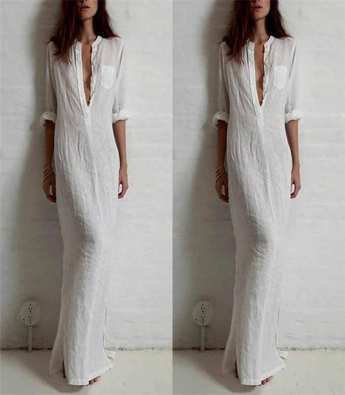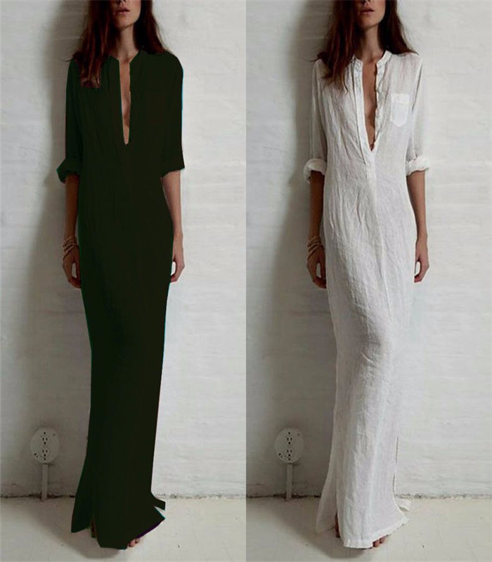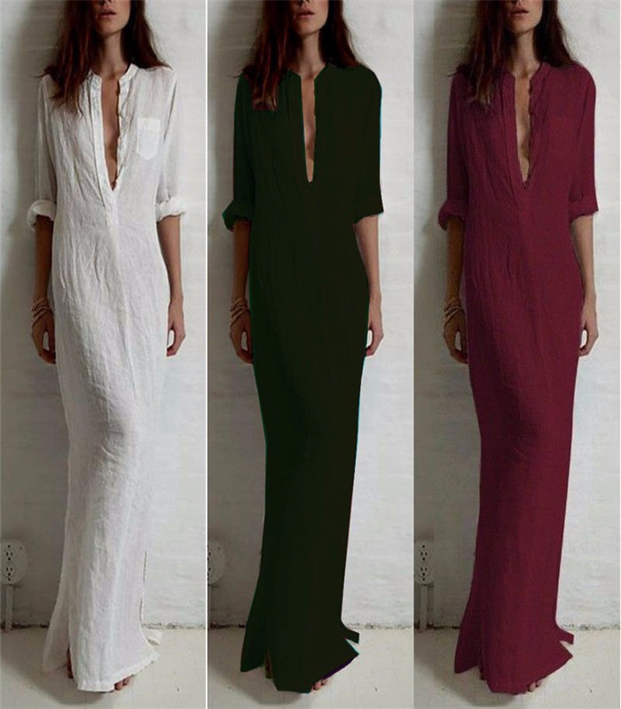 Frauen Sexy Lange Maxi BOHO Tiefem V-ausschnitt Kleid Sommer Strand Kleider Baumwolle Leinen Sommerkleid 59