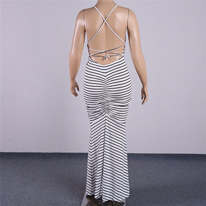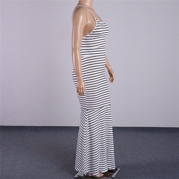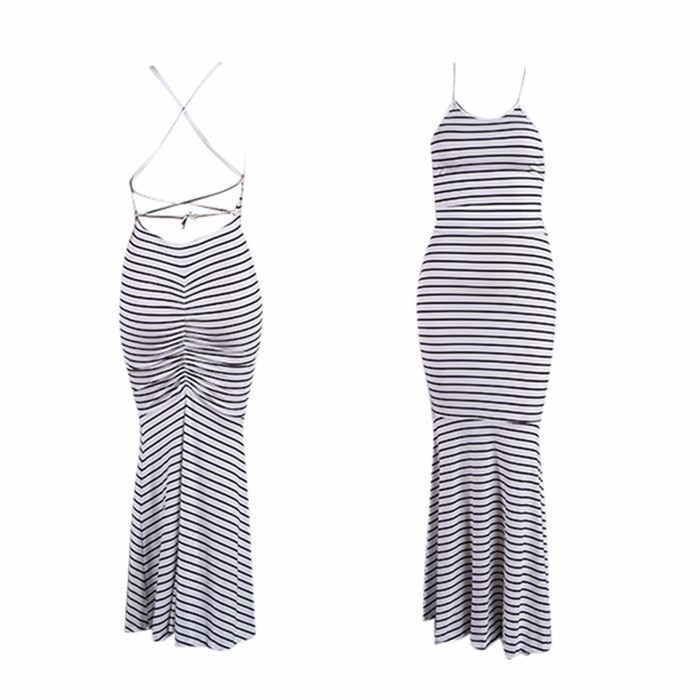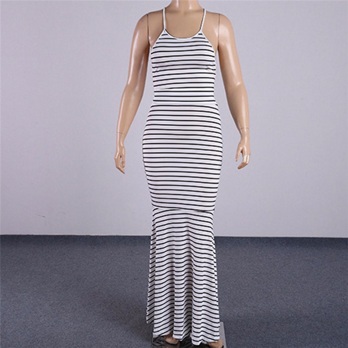Frauen Sommer Sexy Streifen Schlinge Fischschwanz Kleid Lssig Boho Lang Maxi Strandkleid Weste Sundress59
