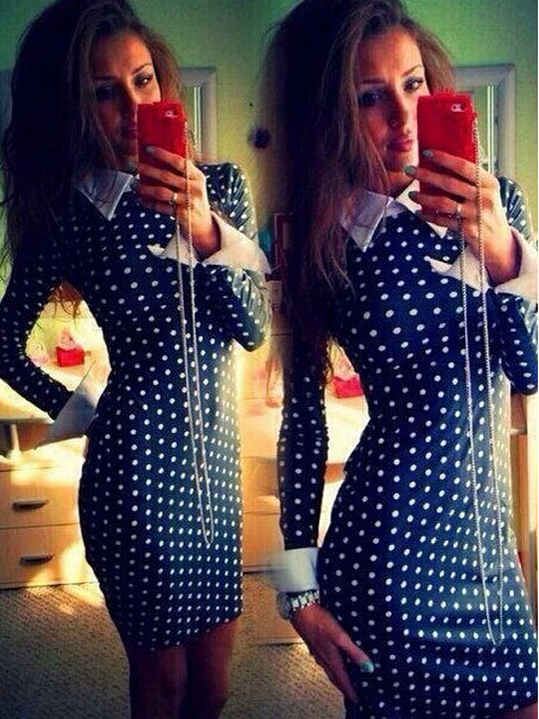 Sexy 2015 Damen Langarm Slim Bodycon Partei Schlank Dot Minikleid