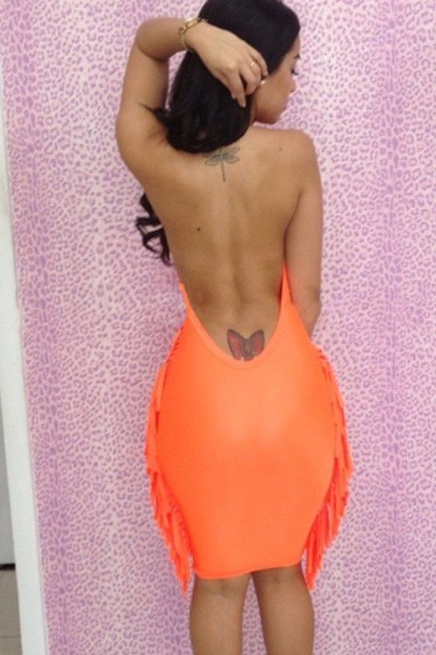 2014 Frauen Dame Sexy orange condole backless Quaste Abend Bodycon Kleid Spandex Club wearF8078