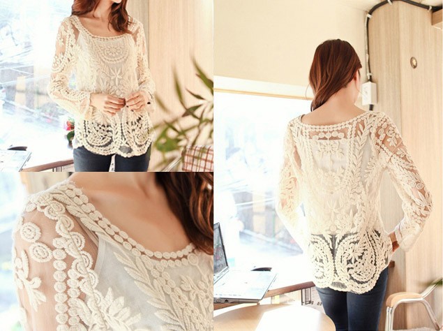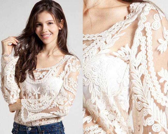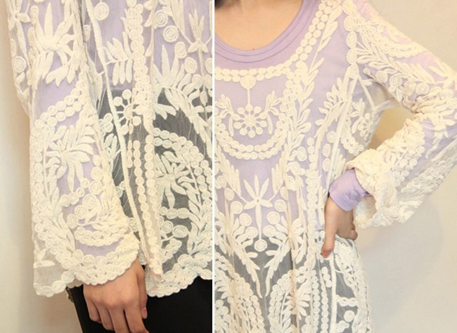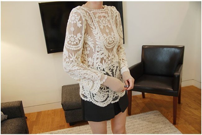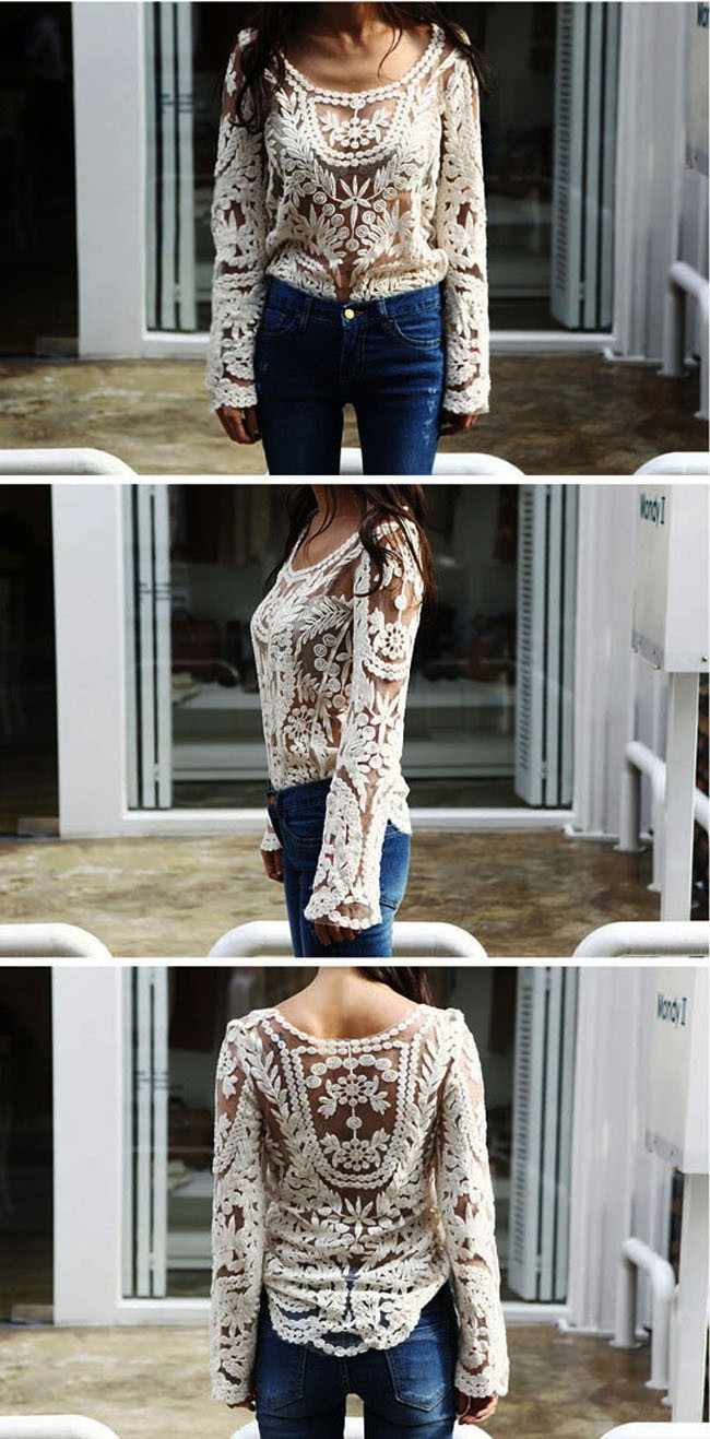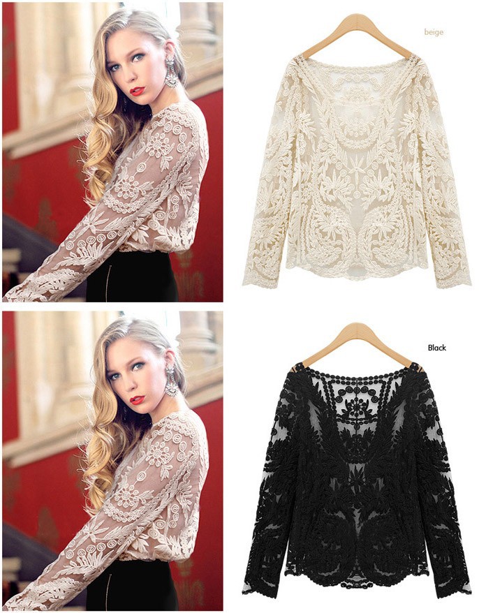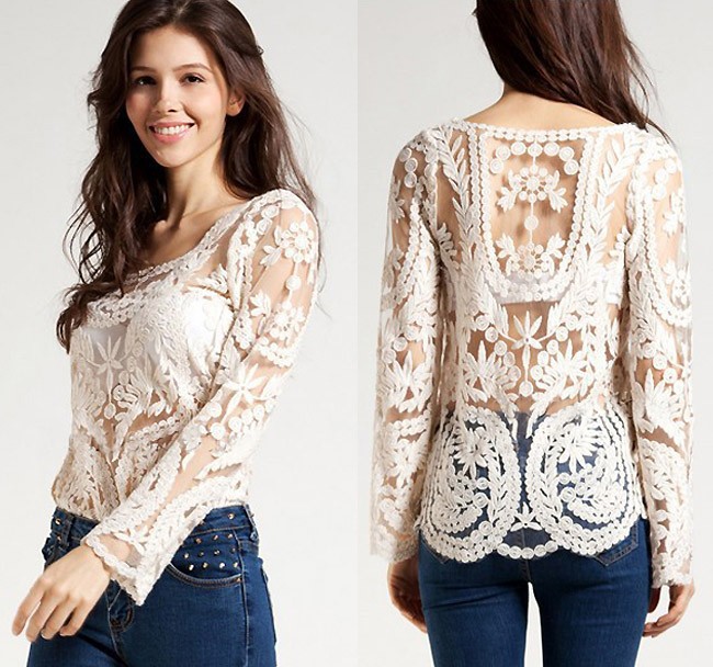 2015 neue Se Halb Sexy Sheer Long Sleeve Vintage Stickerei Blumenspitze Crochet aushhlen T Top Kleid Bluse DropShipping