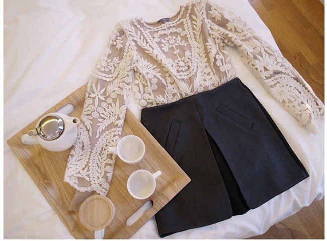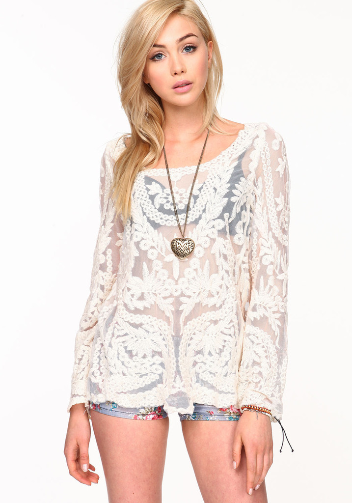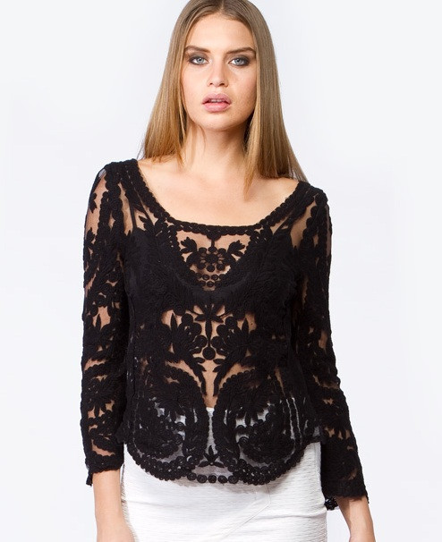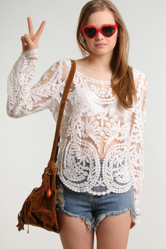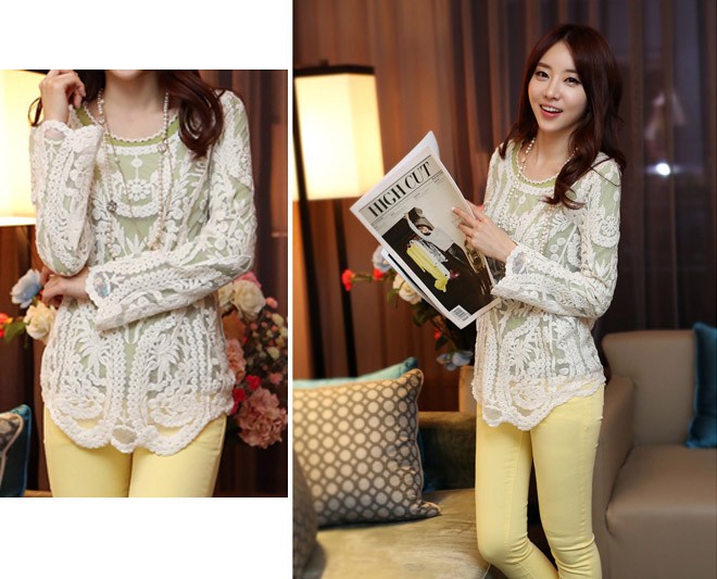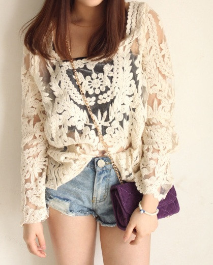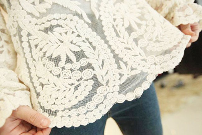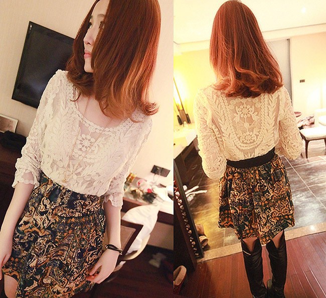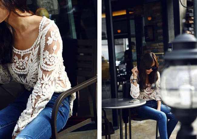 2015 neue Se Halb Sexy Sheer Long Sleeve Vintage Stickerei Blumenspitze Crochet aushhlen T Top Kleid Bluse DropShipping
