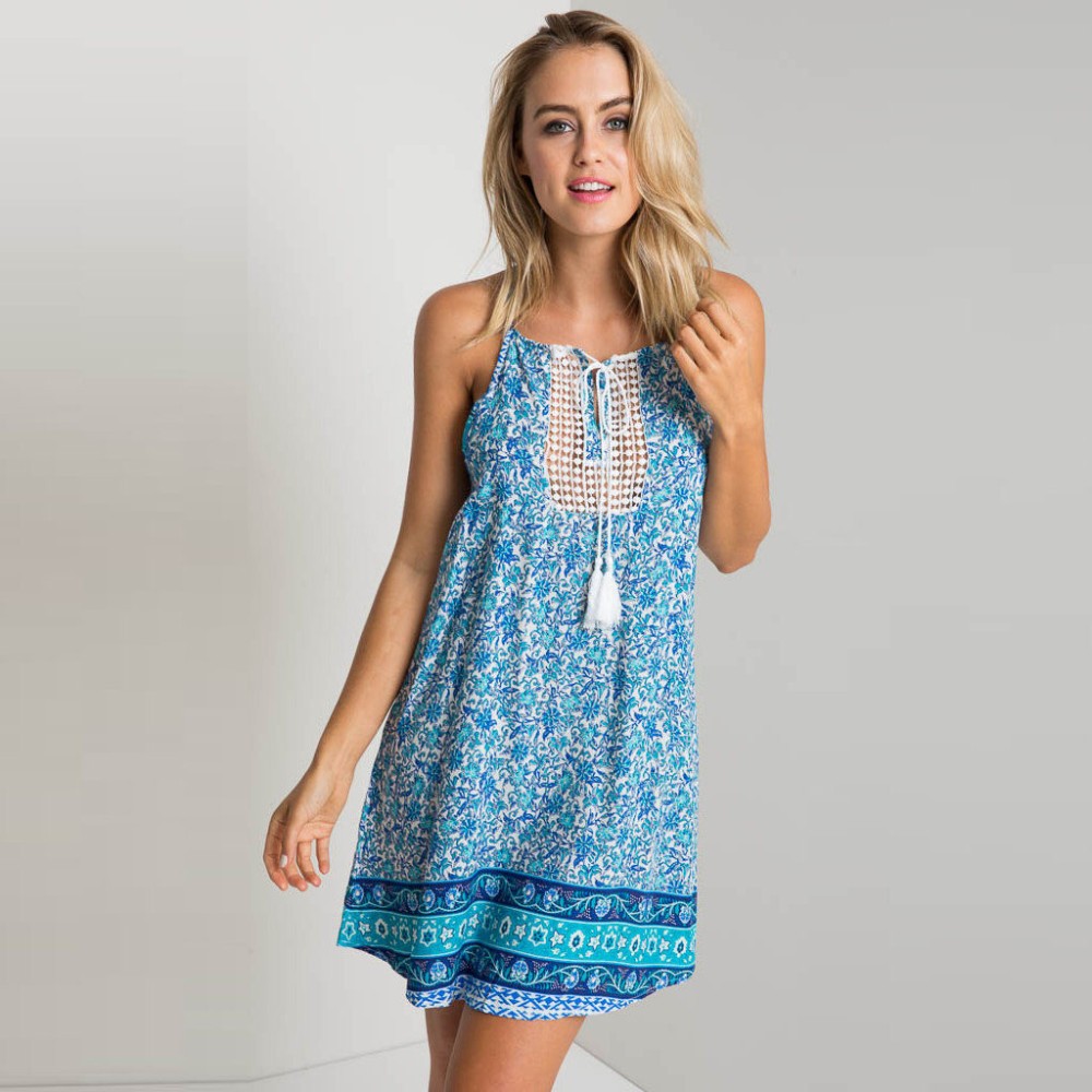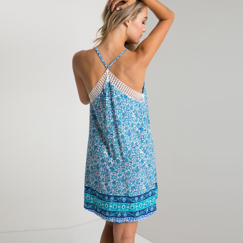 2016 frauen Blau Blumendruck Appliques Vorn Sleeveless Y Zurck Minikleid Spaghettibgel Sommerkleider 80682