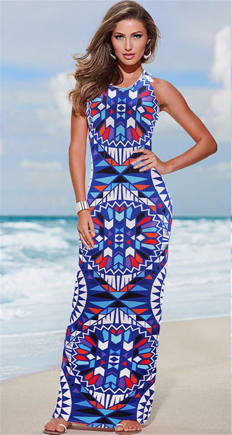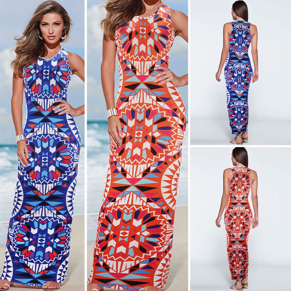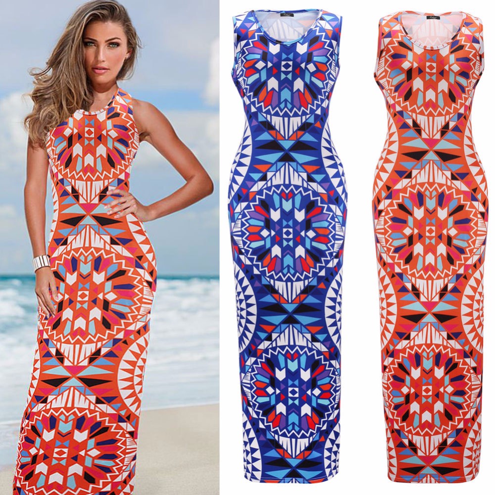2016 frauen Sommer Kleid Geometrische Drucken Bhmischen Strand Casual Langen Kleid Sexy Sommer Schlank Bodycon Lady Maxi Kleid Vestidos