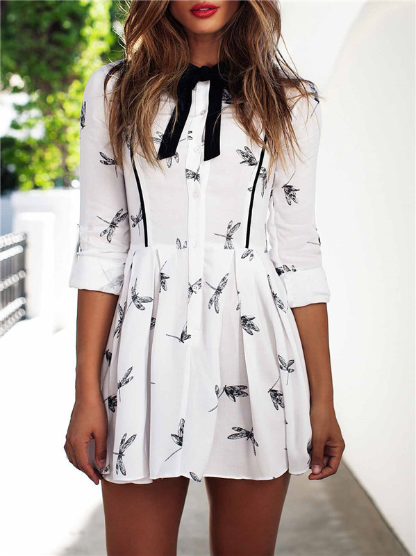 2016 Sexy Mode frauen Libelle Muster Mini Kurze Beilufiges Sommer Beach Party Bund Revers Chiffon-kleid