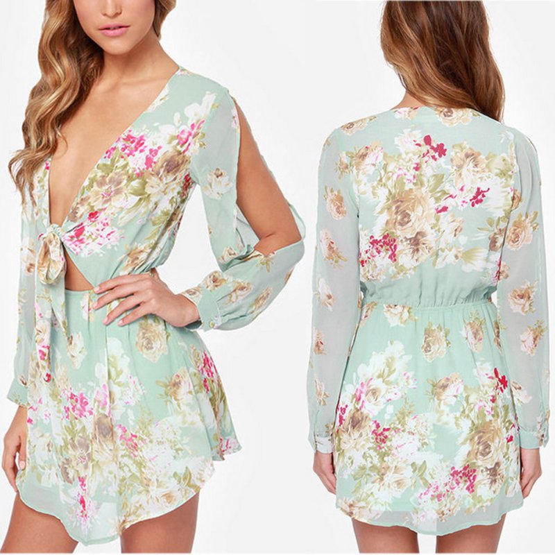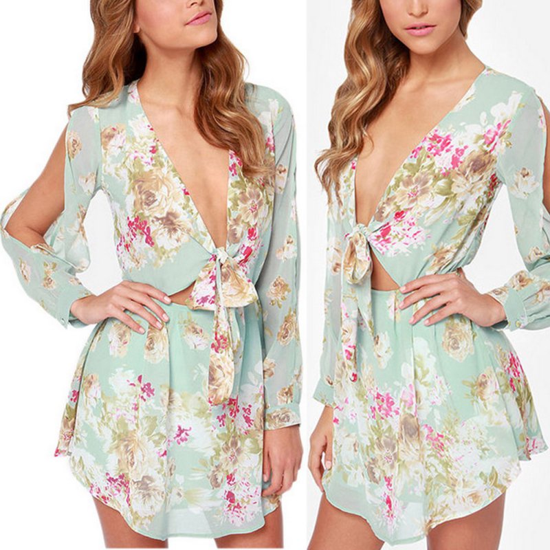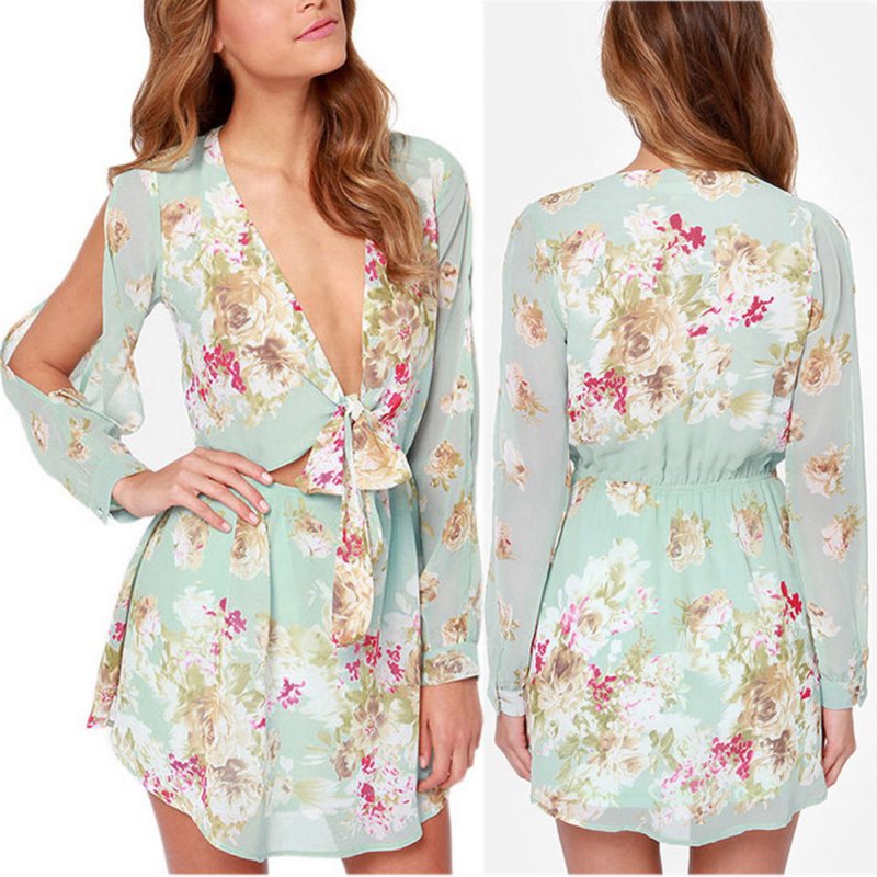 2016 sommer Blumendruck Chiffon Minikleid Sexy schulterfrei Boho Strand Kleider Langarm Kurzes Kleid Cold Shoulder