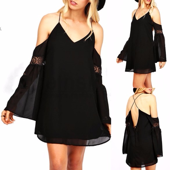 frauen Fashion Sexy Chiffon V-ausschnitt Aufflackernhülse Schulterfrei Strap Backless Spitze Patchwork Feste Kurze A-Line Kleid