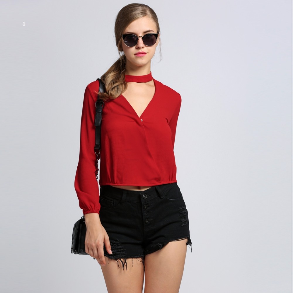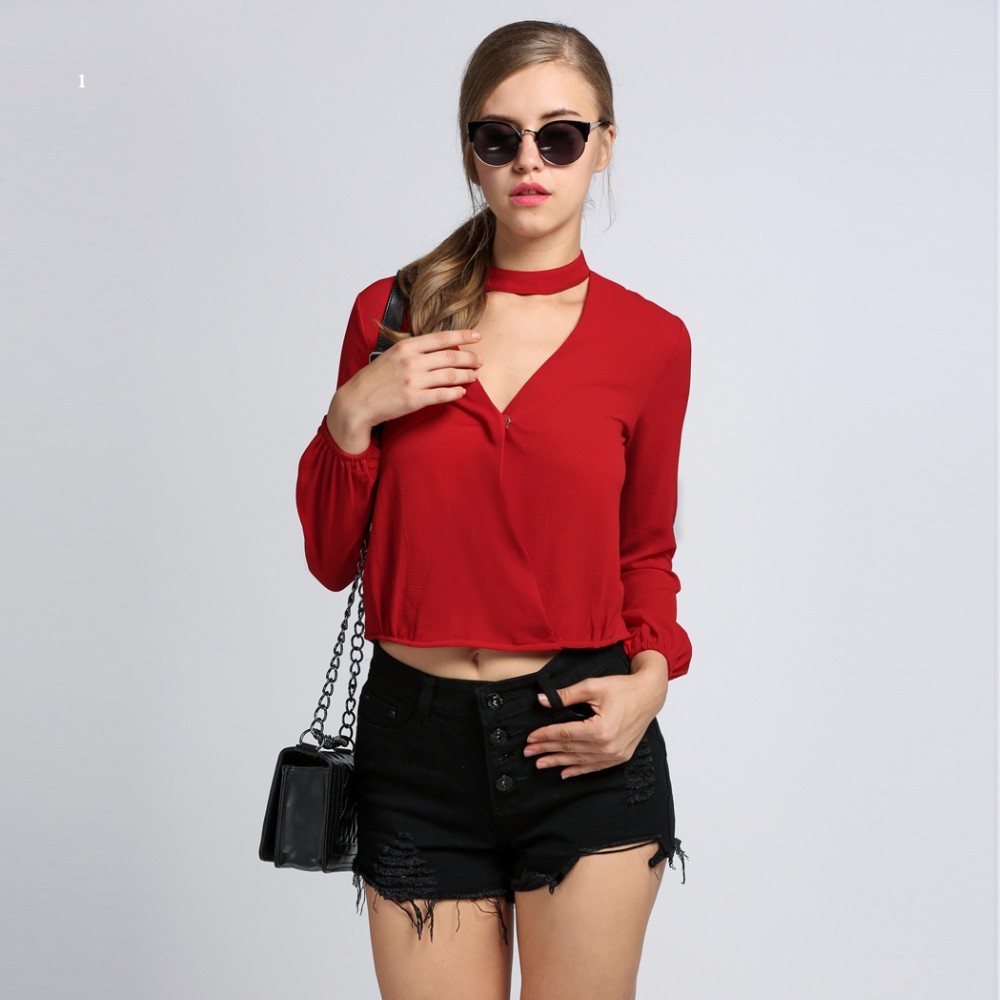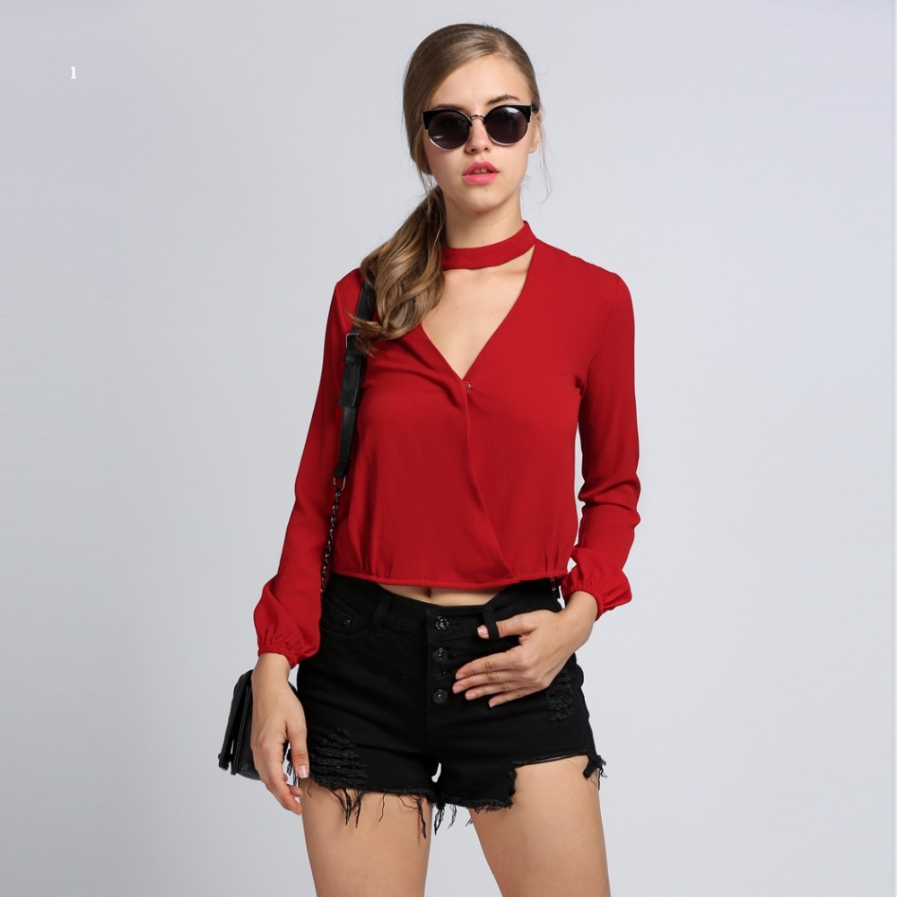 Bluse Femme Sexy Halsband Top Fashion Langarm Frau Formalen Shirt herbst 2016 V Ansatz Halter Herbst Chiffon Tops Damen Roten Kleid