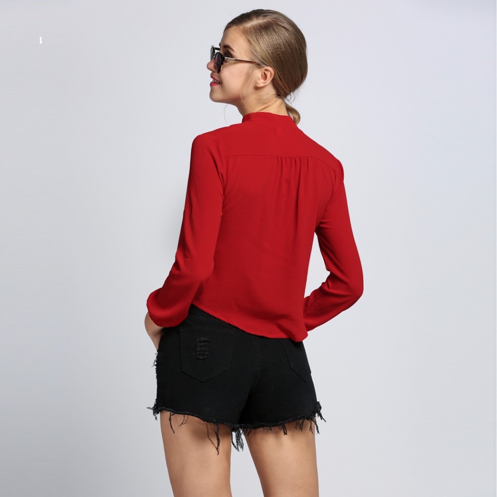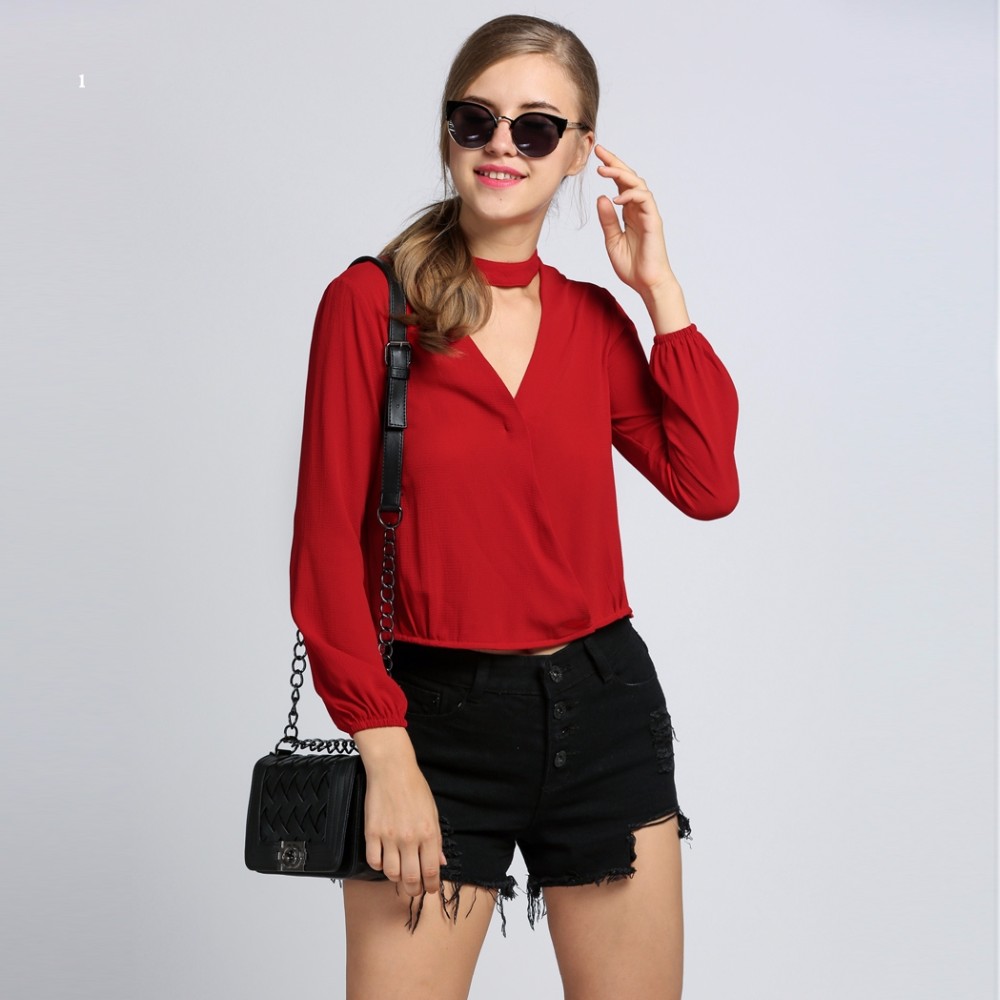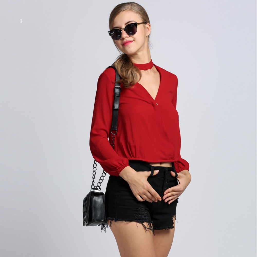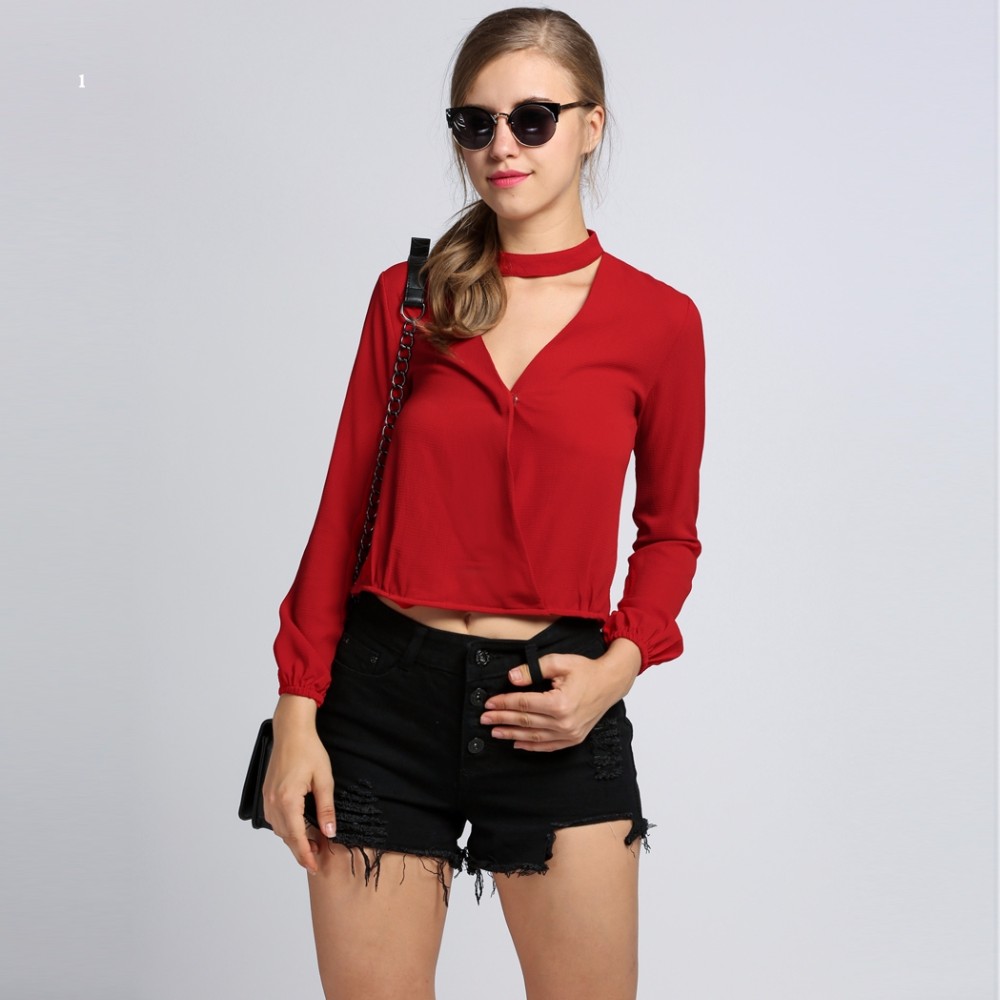 Bluse Femme Sexy Halsband Top Fashion Langarm Frau Formalen Shirt herbst 2016 V Ansatz Halter Herbst Chiffon Tops Damen Roten Kleid