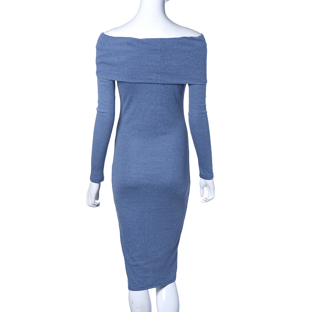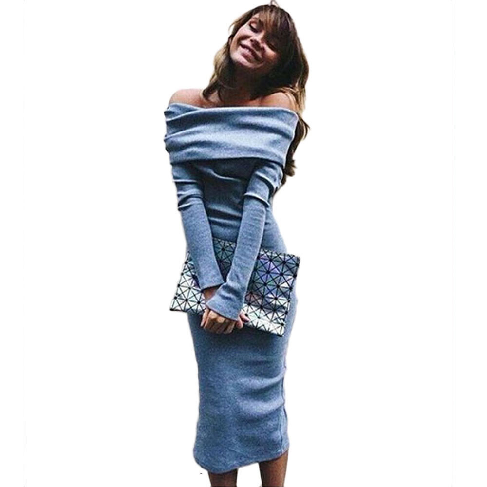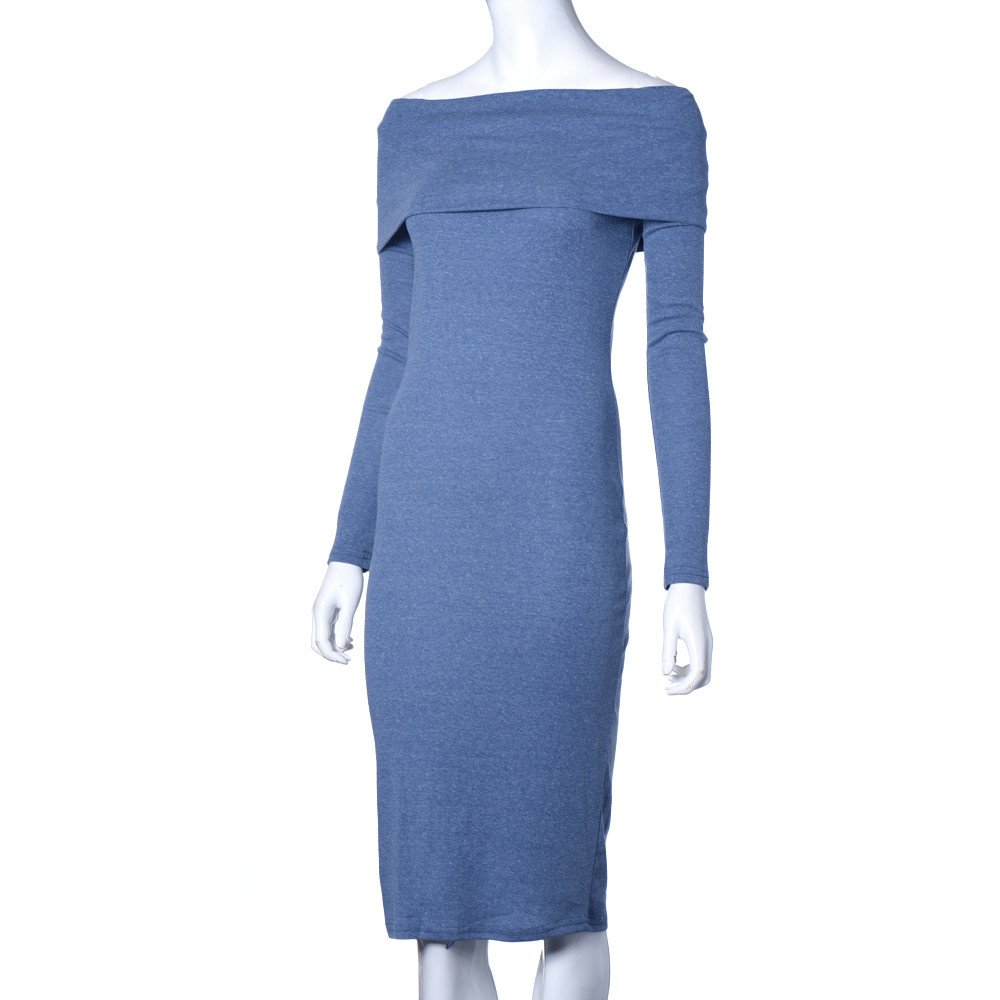 frauen kleider mädchen sommer Langarm Schulterfrei Winter Stretch Bodycon Langes Kleid weibliche vintage vestidos büro kleid blau