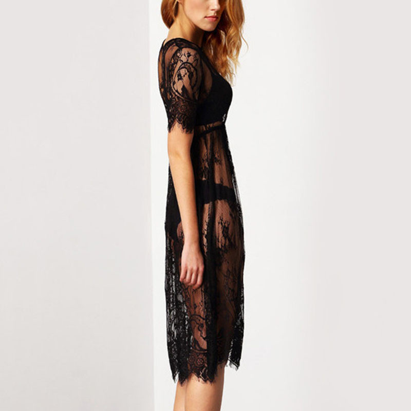 Frauen Midi Kleider Casual Langen Schwarzen Kurzarm O Neck Durchsichtig Strand Tragen Spitze Sexy Kleid