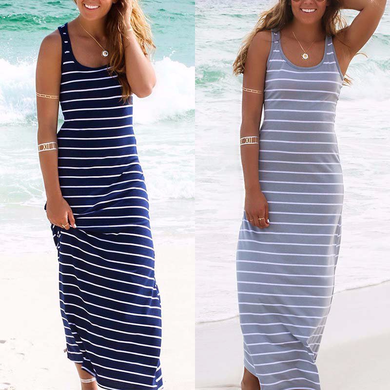 Frauen Striped Boho Lang Maxi Sleeveless Strand Weste Kleid Sexy Damen Casual Kleider