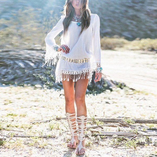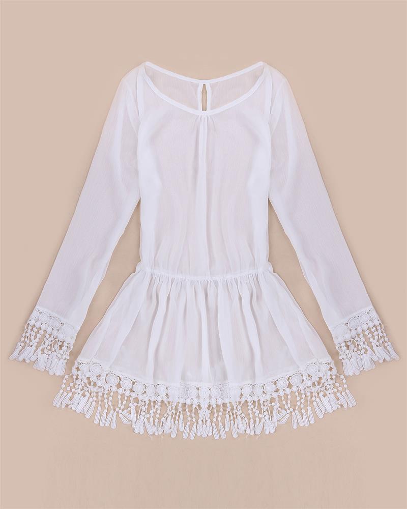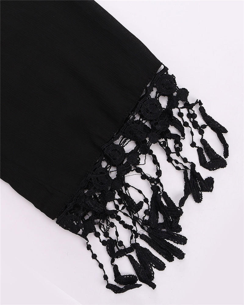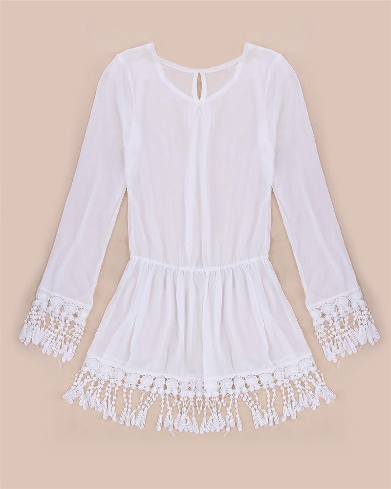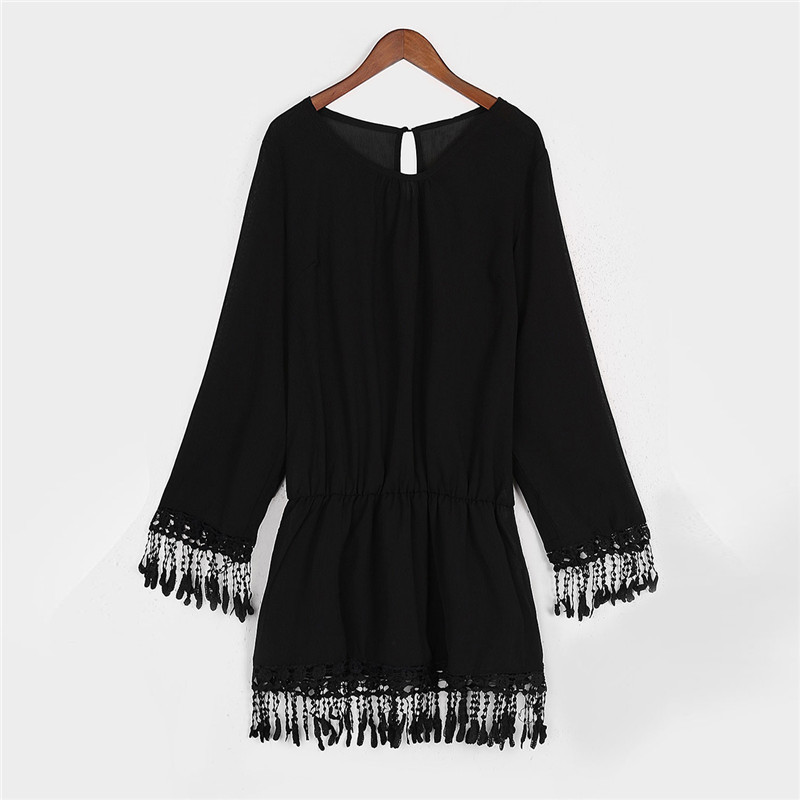 Zanzea Sexy Frauen Sommer Chiffon-kleid Vestidos Lange Hlse Boho Quaste Spitze Patchwork Tunika Aushhlen Strand Minikleid