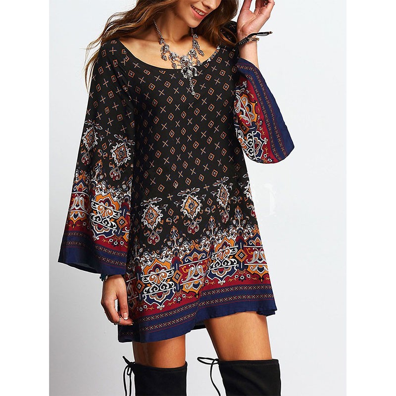 Dame Kleid Sommer Lange Drucken Sleeve Lose Reizvolle Boho Strand Minikleid Ethnische