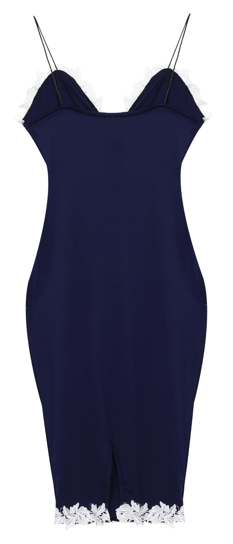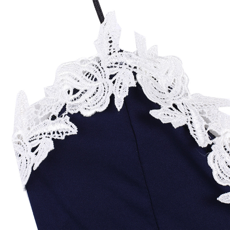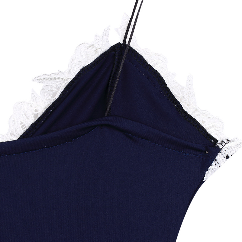 verfügt über eine strappy v-ausschnitt design mit kontrastierenden blumenspitze trim entlang der ausschnitt.