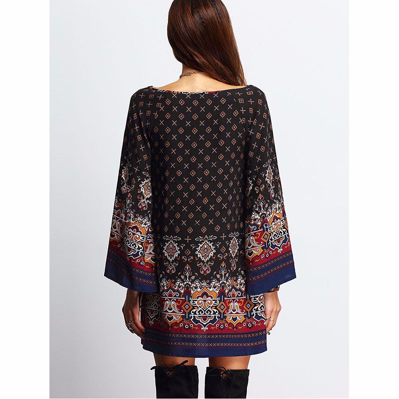 - typ: Frauen Multicolor Scoop Neck Langarm Vintage Print Kleid